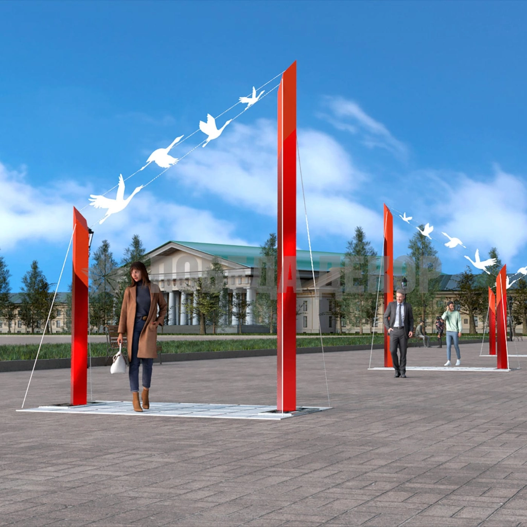 Материал (не более 150 символов)Каркас: сталь, покраска, трос Обшивка: композит, плёнка Подиум: стальной каркас с покраской (4x4 - 2шт.) Пригрузы: тротуарная плитка 400*400*40мм (32 шт.)