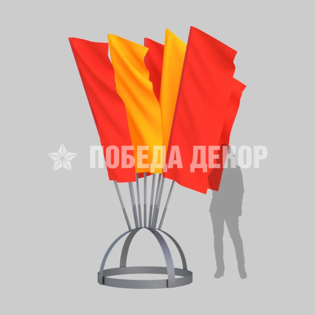 Флаговая конструкция Группа из флагов Костер 9 представляет собой основание, выполнена из толстостенной стальной полосы, имеет форму полусферы с расположенными в верхней части 9-ю штоками для установки флагштоков, флагшток древко диаметр 25 мм х 2,5 метра выполненный из окрашенной алюминиевой трубы.