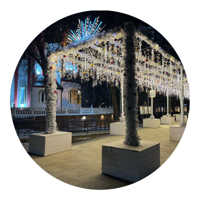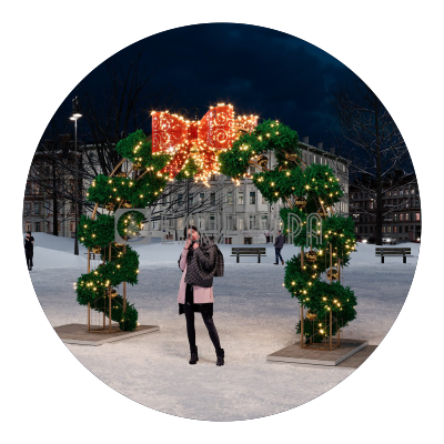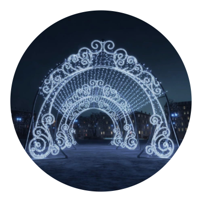 Арка - Каркас: алюминий; обшивка: пластиковые шары; Светотехника: дюралайт, светодиодная нить Медведи - Каркас: сталь, покраска; Светотехника: светодиодная нить