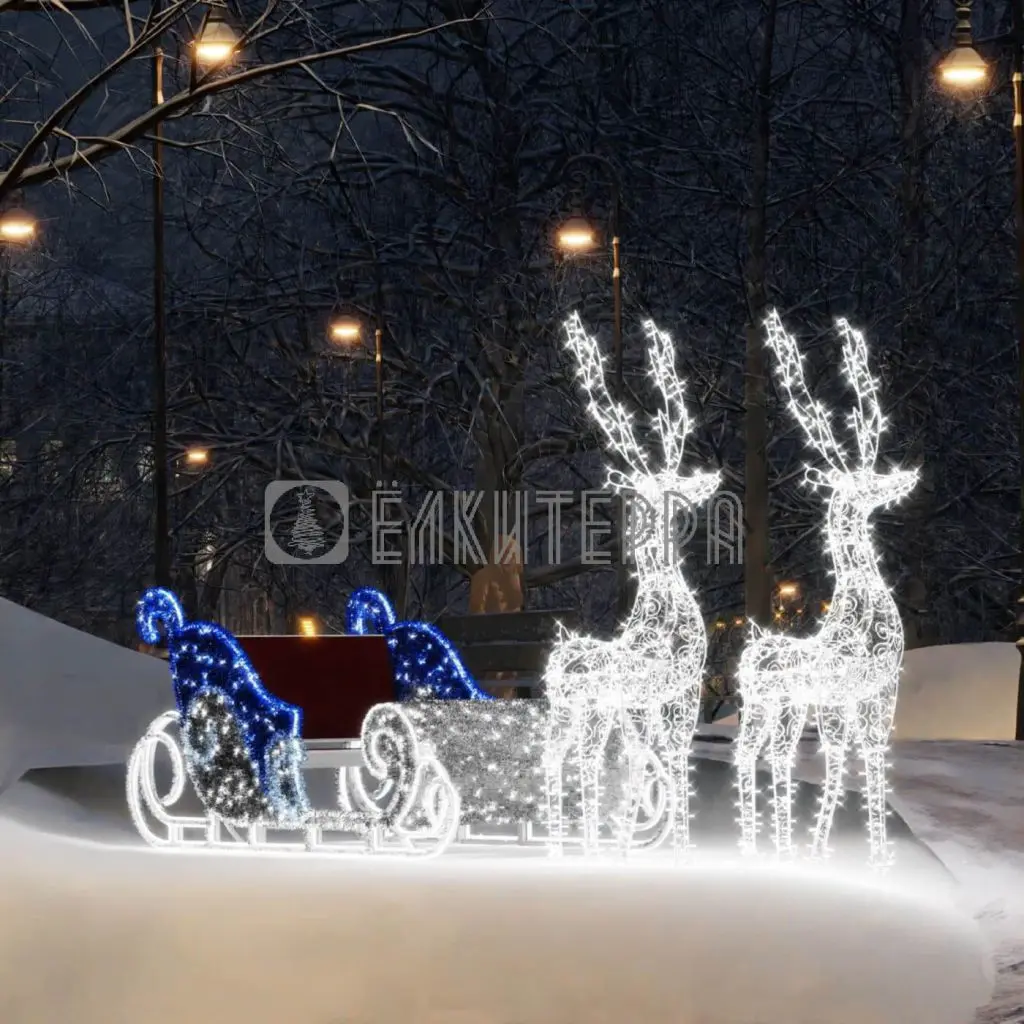 МатериалОлень: сталь с покраской, светодиодная нить Сани: алюминий, мишурный ковёр, доска декоративная, дюралайт, светодиодная нить